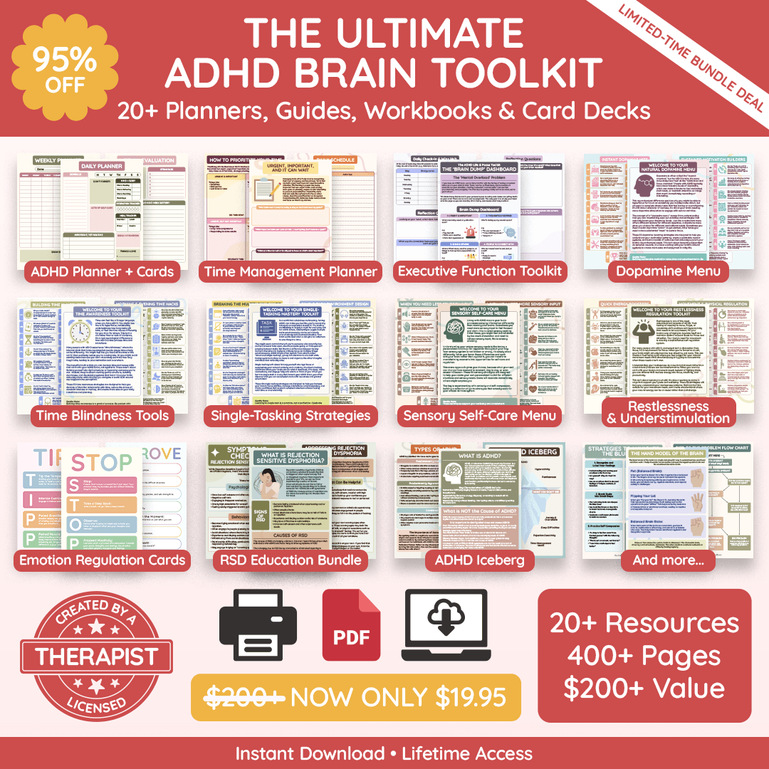 You're getting our complete ADHD Brain Toolkit — 26 digital resources including fillable workbooks, executive function guides, regulation tools, flashcards, planners, and more. These cover everything from emotional regulation and task paralysis to communication skills and daily routines. The total value is over $416.