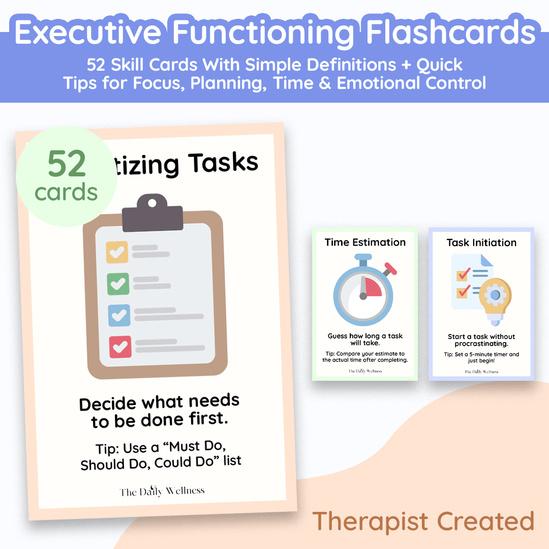 The 52 Executive Function Flashcards are your quick-grab, brain-friendly support system for the exact moment you’re stuck—overwhelmed, distracted, procrastinating, emotionally flooded, or unsure what to do next. Each card breaks an executive functioning skill down into clear, simple language and gives you an immediate action you can take right now—so you don’t have to “figure it out” when your brain is already maxed out. Use them as daily prompts, coaching tools, classroom supports, therapy companions, or a personal reset deck to build consistency over time. Whether you need help starting, planning, shifting gears, remembering, regulating, or following through, these flashcards turn abstract skills into practical steps—so you can make progress in minutes, not “someday.”