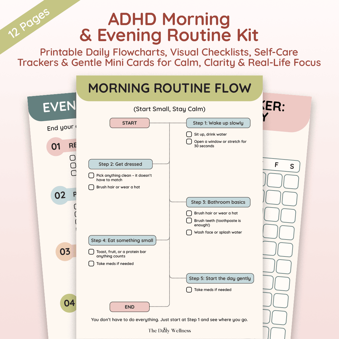 ADHD Morning & Evening Routines Kit is the gentle, no-pressure system that helps you start and end your day with calm—even when motivation is low and your brain feels scattered. Instead of overwhelming “perfect morning” checklists, it gives you simple, step-by-step flowcharts you can follow on autopilot (wake slowly, water, meds, basics, food, one gentle start), plus an evening wind-down flow that supports rest without guilt. You’ll also get a visual daily checklist with icons, an ADHD-friendly self-care tracker (with a blank version to customize), a “Forget-Me-Not” reminder sheet to keep essentials from derailing your day, and encouraging mini motivation cards you can post where you’ll actually see them. Add the “Start Small Daily Planner” and “Make Your Own Routine” builder page, and this kit becomes your customizable routine reset—designed for real life, real energy levels, and real ADHD days.