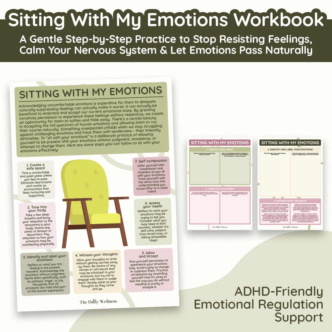 Sitting With My Feelings is a gentle, step-by-step guide for the moments when emotions feel too big, too messy, or too uncomfortable to face—yet bottling them up only makes everything louder. This calming resource helps you slow down and move through feelings safely (instead of spiraling or shutting down) with a simple, supportive process: create a safe space, tune into your body, name what you’re feeling, observe your thoughts without getting hooked, allow the emotion to rise and fall, identify what you need, and respond with real self-compassion. It’s the kind of tool you’ll come back to again and again—because it doesn’t ask you to “fix” your feelings… it helps you finally feel them without being taken out by them.