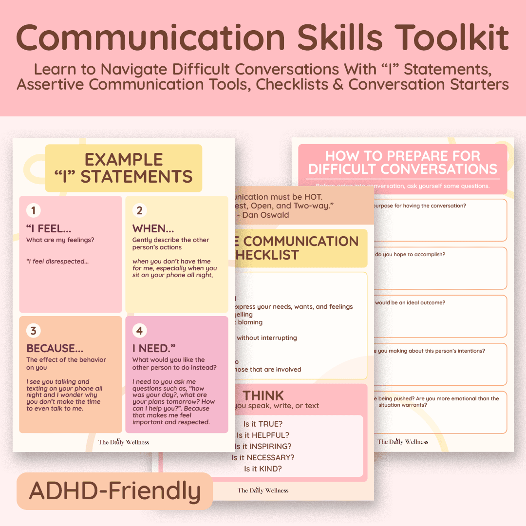 The ADHD Assertive Communication Guide (27 pages) is your step-by-step blueprint for saying what you mean—without overexplaining, people-pleasing, exploding, or spiraling afterward. Built for ADHD brains that feel emotions intensely and process conversations fast, this guide helps you communicate clearly in the moment while still protecting your energy, your boundaries, and your relationships. You’ll learn the difference between passive, aggressive, and assertive communication (with relatable examples), plus ready-to-use scripts for common ADHD struggles like asking for clarity, requesting accommodations, addressing interruptions, handling criticism, and navigating conflict without shutting down. With practical frameworks, boundary phrases, and confidence-building prompts, it turns “I wish I’d said…” into “I handled that really well”—so you can speak up calmly, be taken seriously, and feel good about how you showed up.