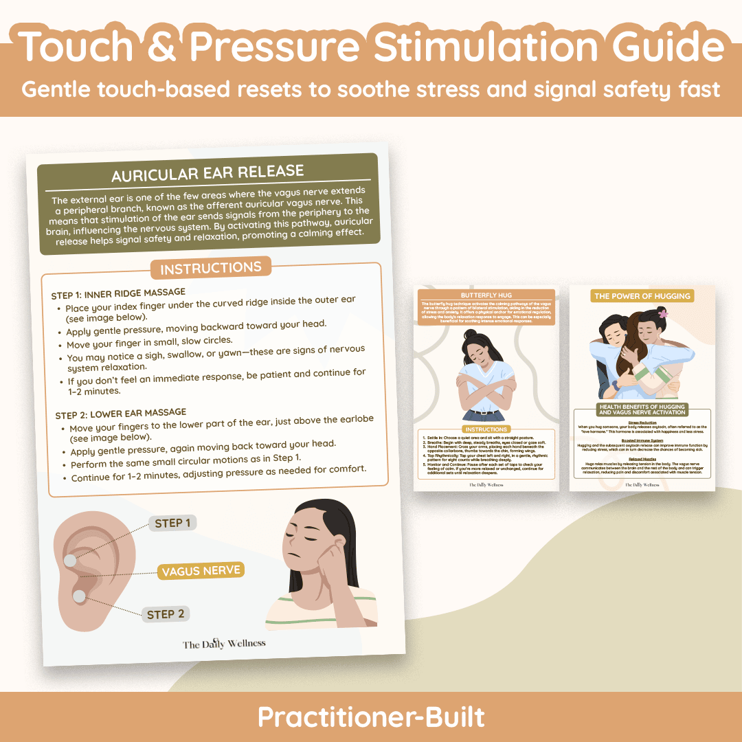 Touch & Pressure Stimulation is your instant, body-first reset for when your nervous system feels wired, overwhelmed, or emotionally “too much”—because deep pressure and soothing touch can tell your brain you’re safe faster than thoughts ever will. This toolkit gives you simple, step-by-step techniques you can use anywhere: the calming Butterfly Hug (bilateral tapping), auricular ear release to gently support vagus nerve regulation, suprasternal notch massage with breath for a quick settle, acupressure points for stress relief, and five soothing hand positions that feel like being held when you need comfort most. Add in facial release and the grounding power of hugging, and you’ve got a practical, no-equipment “nervous system toolkit” you can reach for in the moment—so calm becomes something you can create, not just hope for.