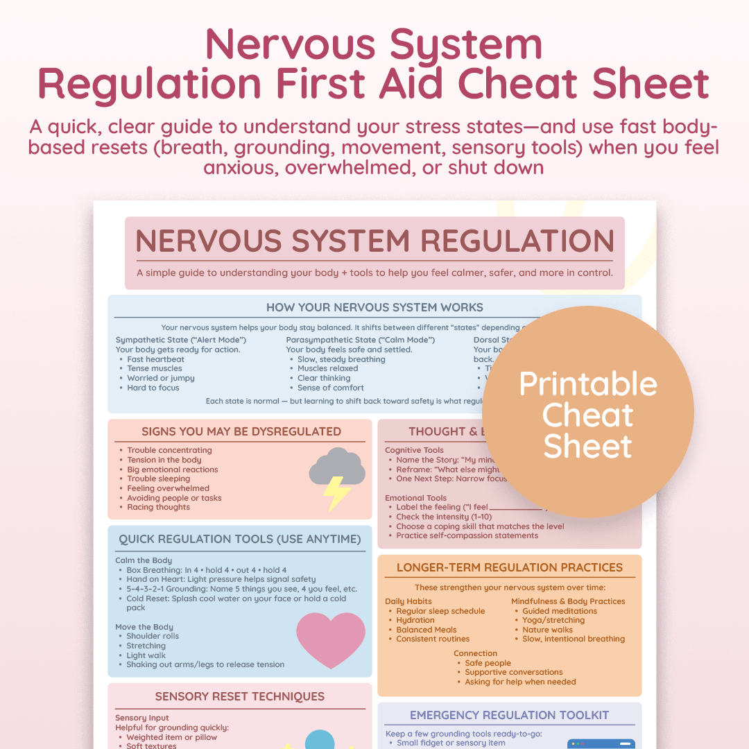 Nervous System First Aid Guide is your emergency “what do I do right now?” plan for the moments you’re spiraling, panicking, shutting down, or feeling completely overwhelmed. Instead of trying to think your way out (when your thinking brain is offline), this guide gives you quick, body-based interventions that help your system shift states fast—so you can stabilize first, then problem-solve. You’ll learn how to identify what state you’re in (fight/flight, freeze/shutdown, or safe/connected), choose the right tool for that state, and follow simple step-by-step exercises—breath resets, grounding cues, sensory supports, movement releases, soothing touch, and co-regulation strategies—without guessing. Keep it on your phone or print it for easy access, and you’ll always have a calm, compassionate “first response” when life hits hard.