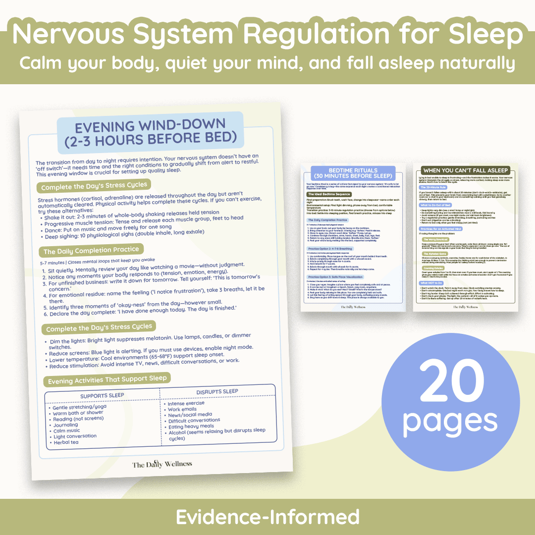 Nervous System Regulation for Sleep is the guide that finally explains why you can be exhausted—yet still lie awake with a racing mind or a wired body: sleep isn’t something you can force… it’s something your nervous system allows when it feels safe. This beautifully structured workbook teaches you how to shift out of fight/flight or shutdown and into the calm, regulated state where deep rest can happen—using a simple timeline that supports you all day: evening wind-down practices to complete stress cycles, 30-minute bedtime rituals that cue safety (like body-softening scans, 4-7-8 breathing, safe-place visualization, gratitude + release), and a clear plan for 3am wakeups so you don’t spiral into clock-watching and panic. It even shows you how to set up better sleep in the morning with light, routine, and nervous-system-friendly habits—so your nights become more restorative and your body learns, again and again, “it’s safe to let go.”