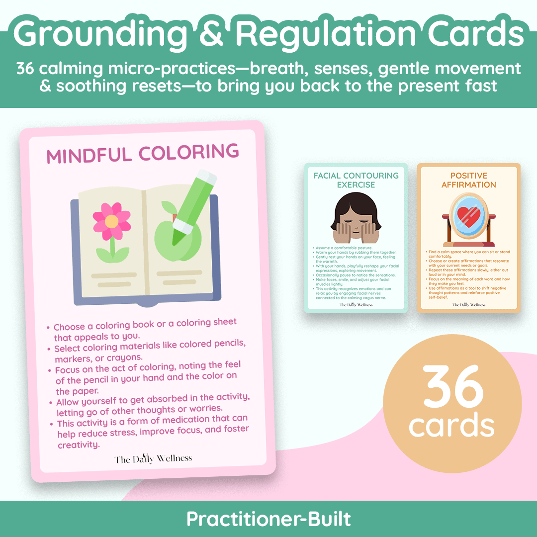 Grounding & Regulation Cards are your ready-to-use calm kit for the exact moments you feel anxious, overwhelmed, disconnected, or emotionally flooded—because when your nervous system is activated, you don’t need another explanation… you need a next step. This beautifully designed deck gives you simple, step-by-step practices you can follow instantly, even when your brain is foggy: 5-4-3-2-1 grounding, body scan meditation, progressive muscle relaxation, butterfly hug, diaphragmatic breathing, guided imagery, mindful walking, chair yoga, finger-hold practice, mindful eating, warmth + comfort, water sensory grounding, sound vibration, and more. Keep them by your bed, desk, therapy chair, classroom, or in your bag—then pull one card, follow the steps, and feel yourself come back to the present with steadiness and control.