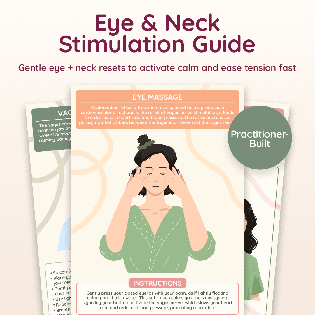 Eye & Neck Stimulation is a fast, body-based reset for when you feel tense, wired, dissociated, or stuck in stress—because sometimes the quickest way back to calm isn’t “thinking differently,” it’s shifting your physiology. This mini toolkit targets two powerful access points to regulation—the eyes and the neck—using simple, gentle techniques that help signal safety to your nervous system and support vagal tone: soothing eye massage, tension-melting eye yoga, the diagonal eye relaxation technique, cervical spine mobilization, platysma stretching, a calming vagus nerve neck massage, and a three-point focus exercise that brings you back into the present quickly. Perfect for screen fatigue, jaw/neck tightness, racing thoughts, and overwhelm, it gives you clear step-by-step instructions you can do anywhere—so you can feel grounded, steady, and back in your body in just a few minutes.