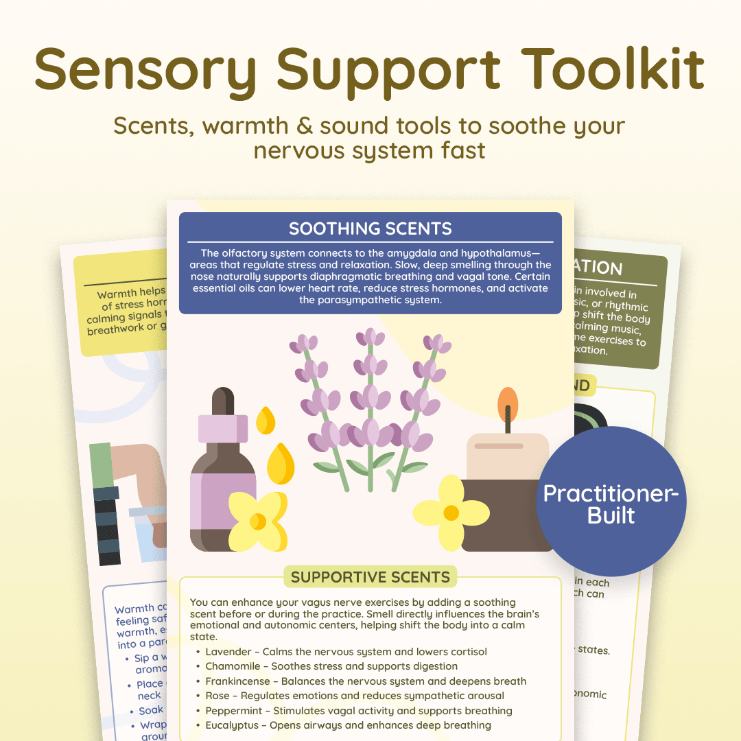 Sensory Support is your “feel safe again” shortcut—because when your nervous system is dysregulated, the fastest way back isn’t always talking or thinking… it’s sensory cues that signal safety to your body. This calming mini toolkit gives you simple, comforting options you can use anytime you feel overwhelmed, anxious, edgy, or shut down—like soothing scents to soften stress, gentle warmth to settle the body and invite relaxation, and sound + music supports that help steady your system and bring you back into the present. It’s quick, practical, and incredibly grounding—perfect for creating a personal “regulation ritual” you can reach for in the moment, so calm becomes something you can access on purpose (not just when life finally slows down).