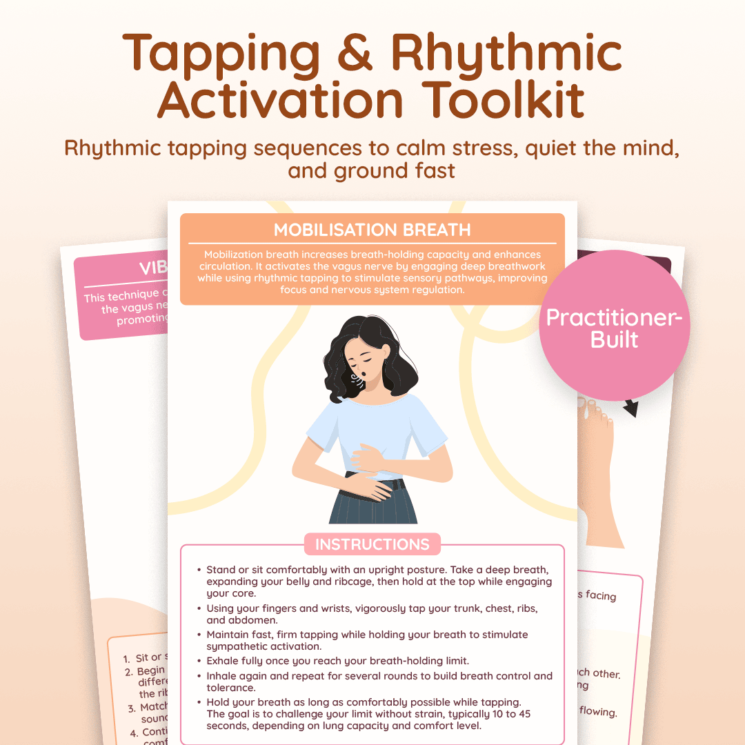 Tapping & Rhythmic Activation is your “regulation in real time” toolkit for when your body feels keyed up, your mind won’t shut off, or you’re stuck in that restless, uneasy in-between. It gives you a menu of simple, rhythmic practices that work fast because they speak your nervous system’s language—pattern, repetition, and sensation. Inside you’ll find Body Drumming (leg taps + chest taps + snaps) to discharge stress and restore balance, an easy-to-follow EFT tapping sequence with calming phrases for emotional relief, Mobilisation Breath (breath + tapping) to reset your state when you feel flooded, Vibrational Humming Taps for a soothing, grounding “vagus nerve-friendly” calm, Brain Tapping to quiet mental chatter, and Toe Tapping to bring you back into your body when you feel ungrounded. No complicated routines—just clear, step-by-step exercises you can use anywhere to shift from spiraling to steady in minutes.