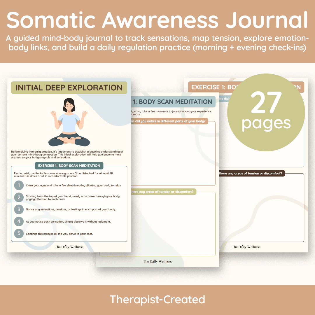Somatic Awareness Journal is your gentle, guided path back into your body—especially if you’ve spent years living in your head, powering through stress, and only noticing your needs once you’ve hit burnout. Instead of “just write your feelings,” this journal teaches you how to track what your body is saying first—so you can understand the physical language of anxiety, overwhelm, numbness, tension, and emotion in a way that actually creates change. You’ll start with a powerful deep-dive phase (body scan journaling, emotion-to-sensation mapping, and movement awareness), then move into an easy daily rhythm with morning check-ins, evening reflections, and weekly pattern reviews—so insights don’t get lost, they build. Plus, you’ll get deeper somatic prompts like stress-and-tension body mapping, somatic metaphor exploration, embodied emotional release, and a somatic gratitude practice that helps you reconnect with your body with compassion. If you’re ready to feel more grounded, regulated, and self-aware—this journal becomes your daily “come home to yourself” practice.