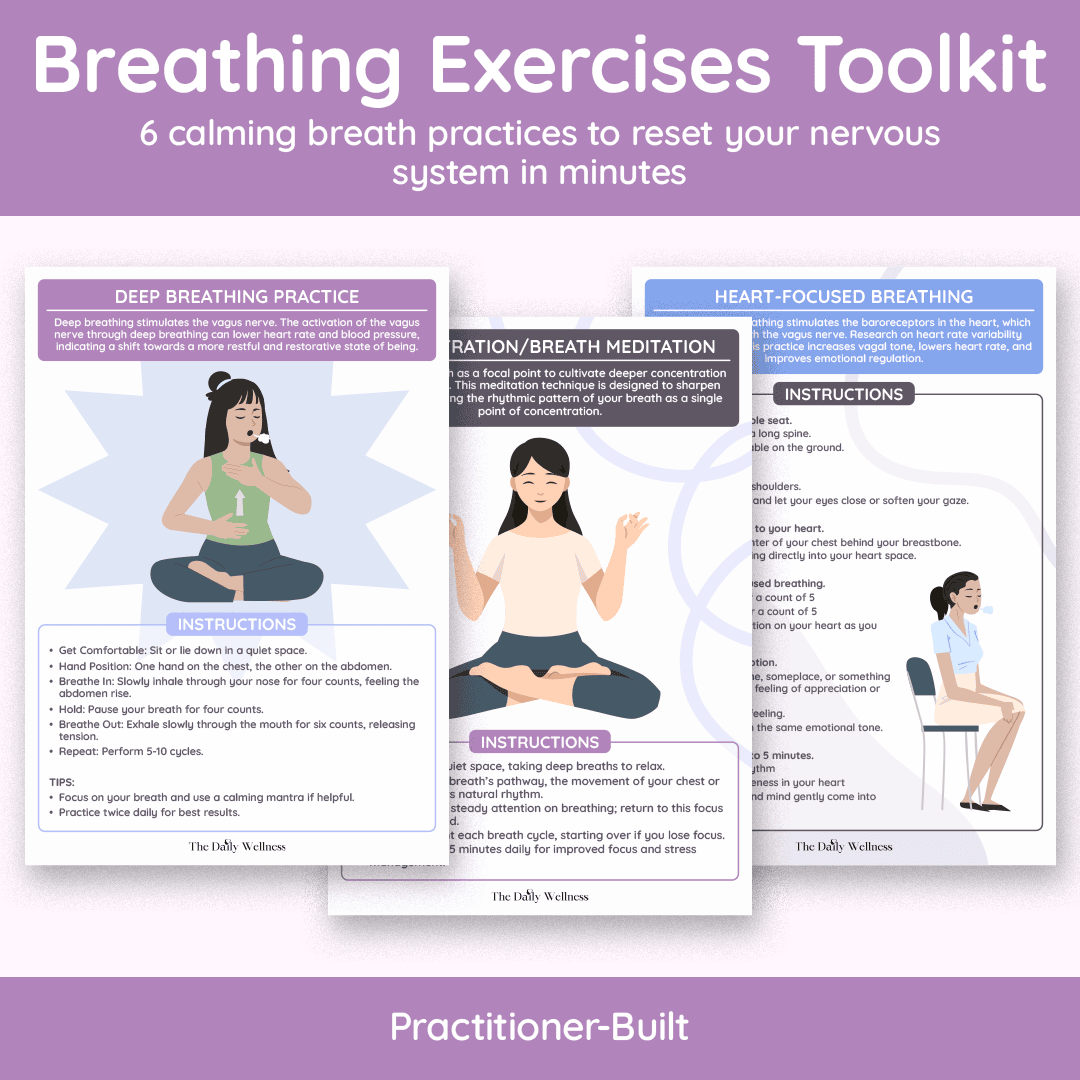 Breathing Exercises is your “regulate in minutes” toolkit—because when your nervous system is activated, breath is the fastest lever you can pull. This beautifully simple guide walks you through a curated set of calming, body-based practices that help shift you out of stress and back into safety: Deep Breathing Practice to stimulate the vagus nerve and settle your system, Heart-Focused Breathing to steady emotions, Alternate Nostril Breathing to balance activation and relaxation, Humming Bee Breath to create soothing vibration through the throat and vagus nerve, Lion’s Breath to release stored tension in the jaw/face/chest, plus a Breath Meditation for focus and grounding. Clear instructions make it easy to use even when you’re overwhelmed—so you can stop “pushing through” dysregulation and start coming home to calm, one breath at a time.