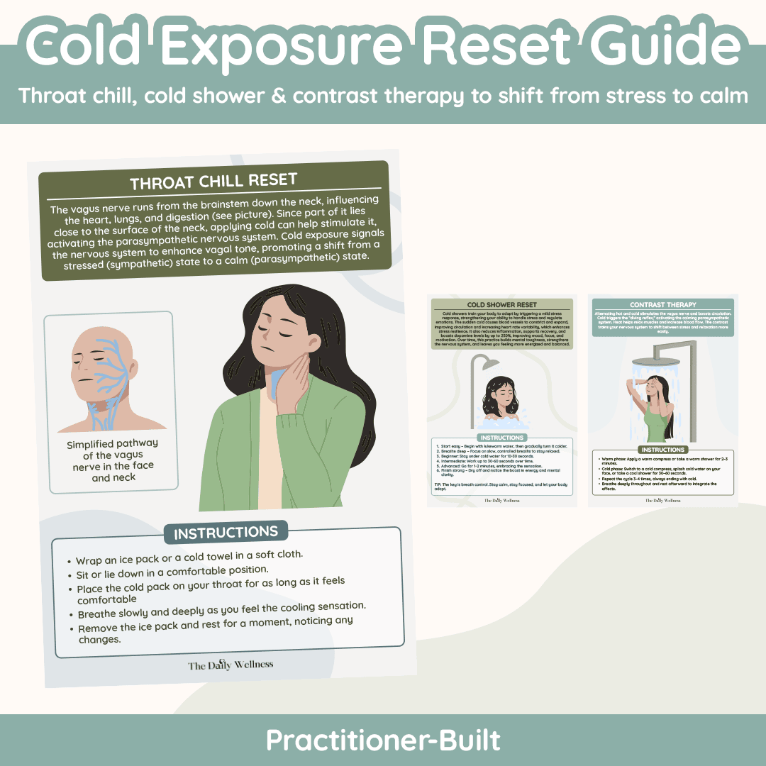 Cold Exposure Reset is the fast, science-backed “snap out of stress” tool for when your nervous system feels stuck on high alert or you need a clean mental reboot. This mini guide gives you three simple options you can use right away—Throat Chill Reset (a gentle cold pack to the neck for a quick calm cue), a step-by-step Cold Shower Reset (with beginner-to-advanced timing so it feels doable), and Contrast Therapy (alternating warm and cold to help your body shift states more easily). It’s clear, practical, and designed to help you feel more grounded, present, and resilient—without complicated routines or equipment.