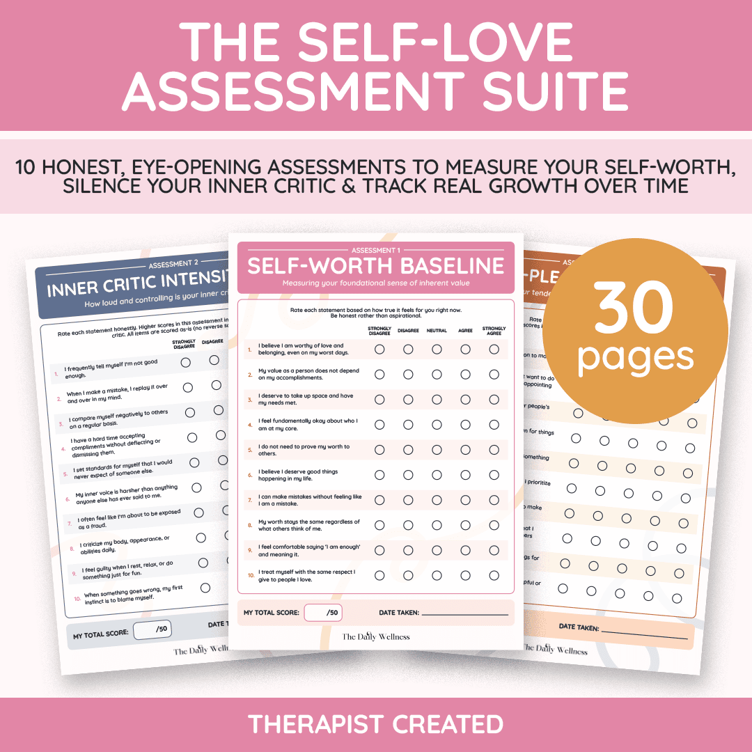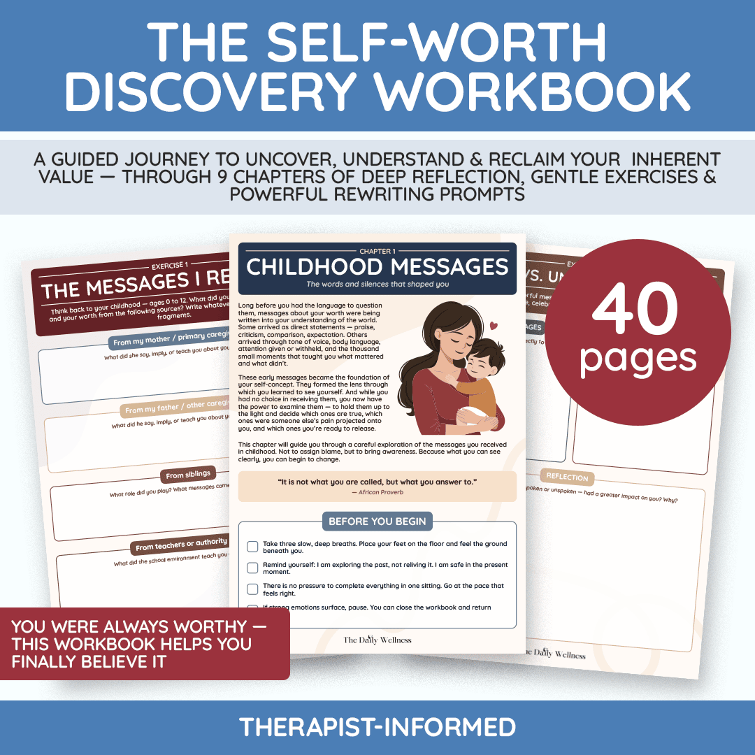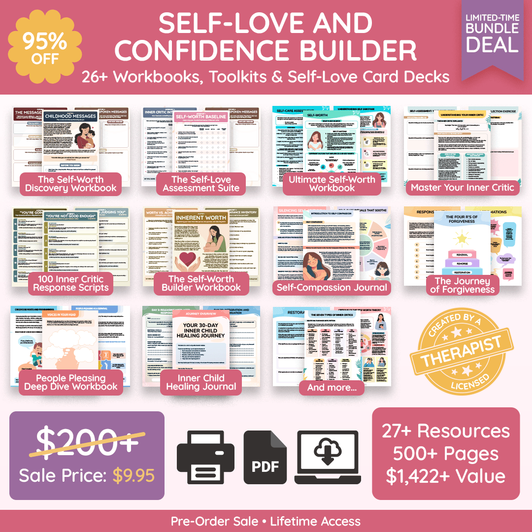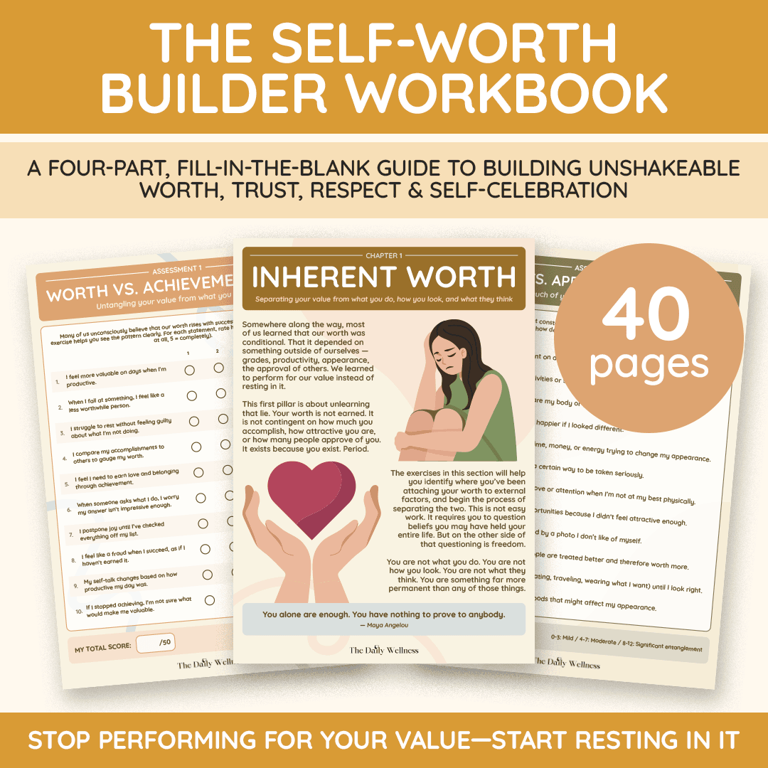 PART 3: Building Unshakeable Self-Worth — Know your value regardless of what anyone else thinks. The Self-Worth Builder Workbook, Validation Detox Workbook, and Comparison Cure Workbook help you stop outsourcing your worth to other people and start generating it from within.