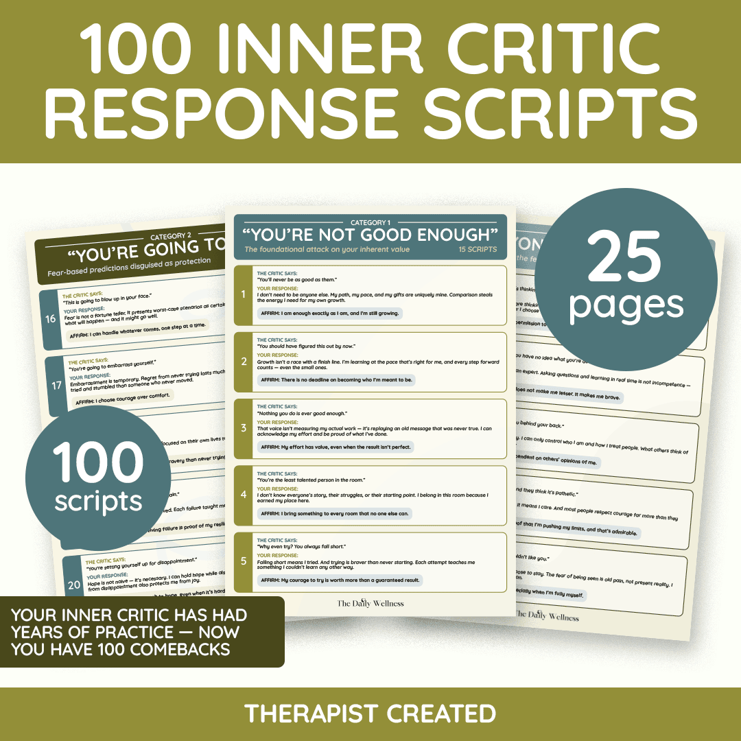 PART 2: Silencing the Inner Critic — That voice tearing you apart isn't telling the truth. The Inner Critic Transformation Workbook and 100 Inner Critic Response Scripts give you the exact tools to talk back to the cruelest voice you know — the one inside your own head.