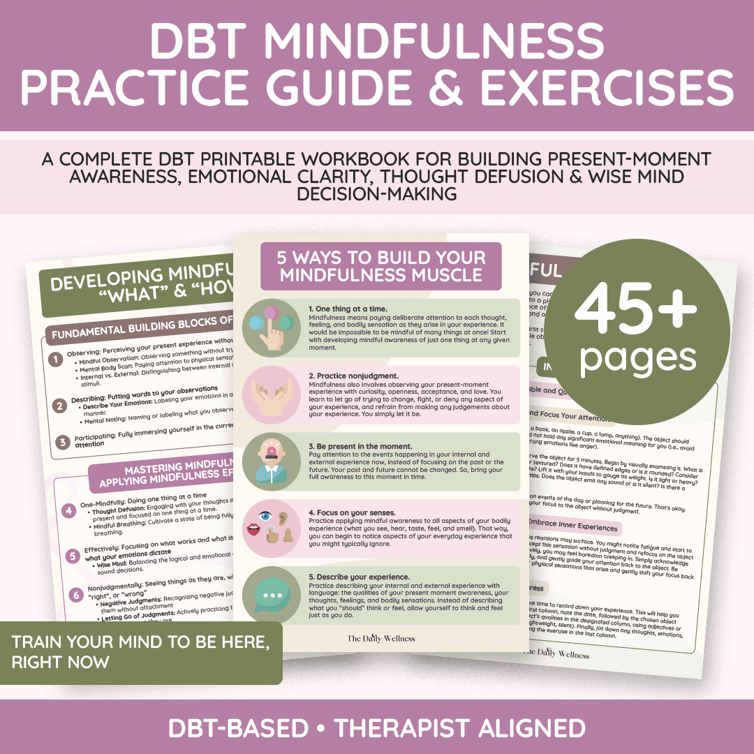 Knowing mindfulness skills and having a daily mindfulness practice are two completely different things. This guide bridges that gap. It gives you a structured daily practice built specifically around DBT principles — not generic meditation content that has nothing to do with emotional regulation. Morning grounding routines. Wise Mind check-ins. Emotion observation practices. A system designed so that over weeks and months, mindfulness stops being something you remember to do and starts being how you actually move through your life.