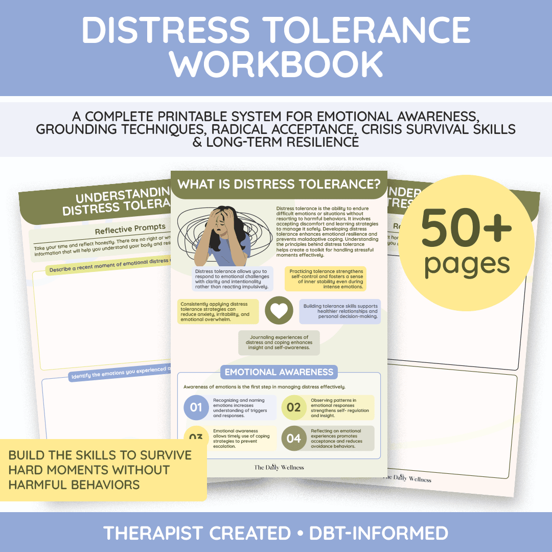 PART 3: Distress Tolerance Module — For when the crisis is happening right now and you need to survive it without making it worse. The Complete Distress Tolerance Workbook, Radical Acceptance Workbook, Crisis Survival Skills Quick Guide, Self-Soothe & IMPROVE Cards, and Distress Tolerance Diary give you real tools for the real moments when everything inside you is screaming — and the worst thing you could do is act on it.