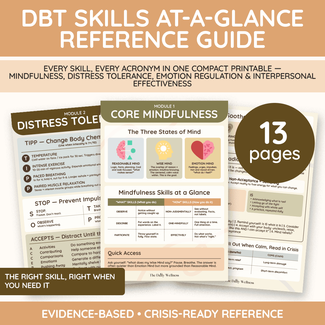 You're in the middle of something hard. You remember there's a skill for this. You can't remember what it's called. This guide is the solution to that exact problem. Every core DBT skill — every acronym, every key concept, every technique — condensed into one fast-reference document you can pull up in seconds. Keep it on your phone. Keep it on your desk. Keep it anywhere you might need it. Because the best skill in the world is useless if you can't remember it when you need it most.