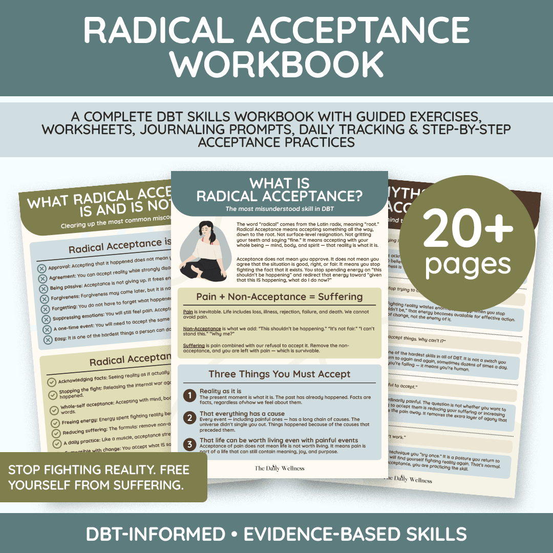 This is the DBT skill people resist most — and need most. Radical Acceptance doesn't mean agreeing that something is okay. It doesn't mean letting people off the hook or pretending the unfair thing didn't happen. It means stopping the war against reality — the exhausting, endless fight against what already is — and choosing to stop letting it take up more of your life than it already has. This workbook walks you through the full process: what radical acceptance actually is, why we fight it even when the fighting is destroying us, and the real, structured practice of turning your mind toward acceptance again and again until it starts to stick. For the person who is still carrying something they can't put down — this workbook shows you where to set it.