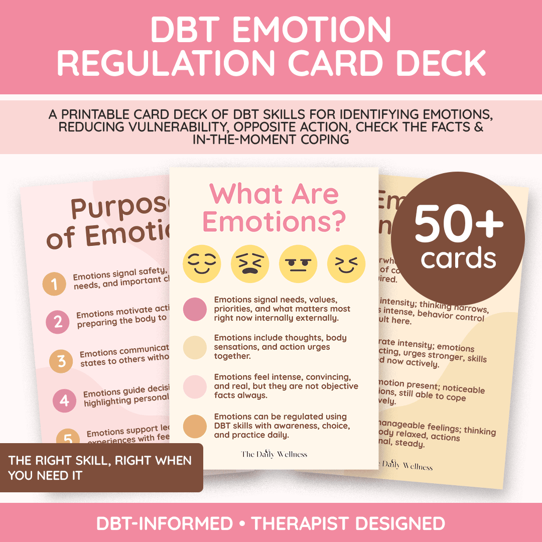 For the emotion that's spiraling and needs something to interrupt it before it takes over completely. Check the Facts prompts that slow the reaction down. Opposite Action guides that redirect the urge. PLEASE skills reminders that address the vulnerability underneath. Emotional intensity tracking cards that help you get specific about what you're feeling instead of just overwhelmed by it. Built for the moment when your emotion is at an 8 and you need a clear path to a 4.