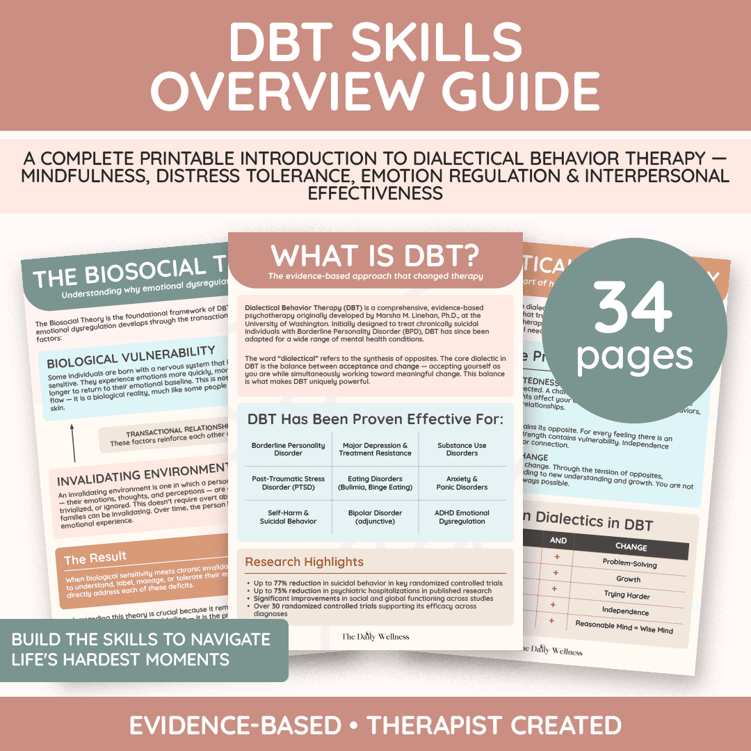 PART 1: DBT Foundations — Because skills work better when you understand the system behind them. The Complete DBT Overview Guide, DBT Skills At-A-Glance Reference Guide, and DBT Self-Assessment Workbook give you the full picture of what DBT is, how it works, and exactly where to start — so you're building on solid ground instead of guessing.