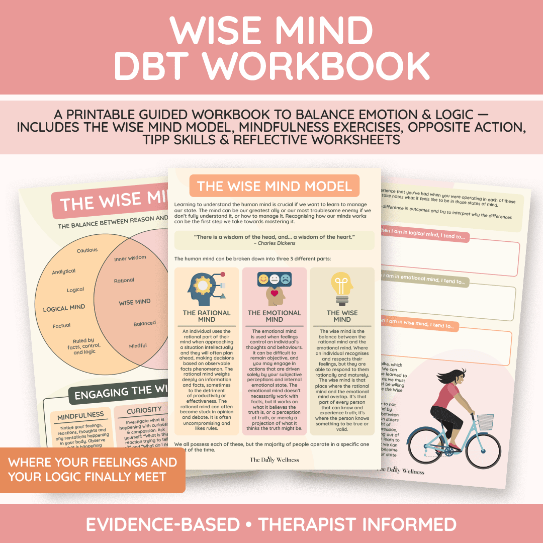 There's a version of you that doesn't react. That doesn't spiral. That knows exactly what to do in a hard moment because she can see the situation clearly — without being flooded by emotion and without shutting down into cold logic. DBT calls that Wise Mind. This workbook helps you find it. Not as a concept you understand intellectually — but as a real, accessible state you can return to even when everything is on fire. If you've ever looked back at a decision made in the middle of an emotional storm and thought "why did I do that" — this is the skill that changes that.