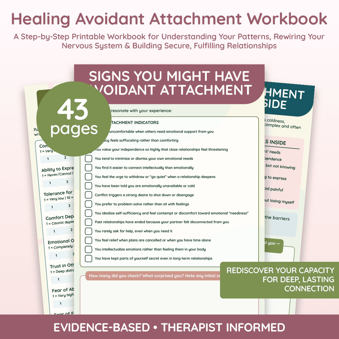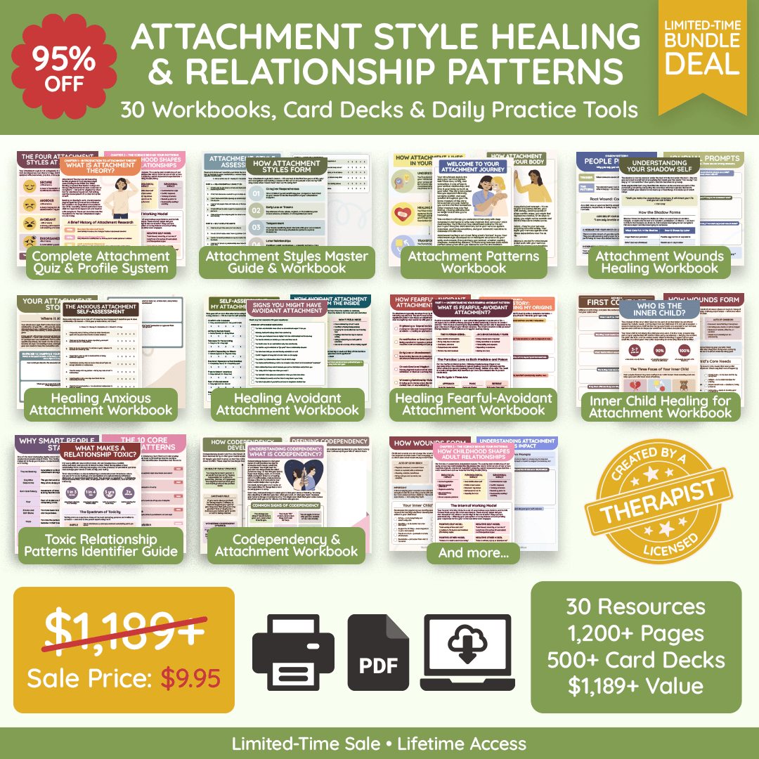 Understanding why you're avoidant won't make you stop ghosting people who love you. That's why every workbook, journal, and card deck in this bundle is built around real exercises — the kind that create the felt, embodied shifts that reading about attachment theory alone never produces.